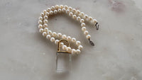 This stunning mother of pearl necklace features 53 lustrous pearls perfectly strung together, creating a timeless and elegant look. At the center, a beautiful Swarovski crystal pendant adds a touch of sparkle and luxury to the piece. The necklace also comes with an original locket chain for added charm.