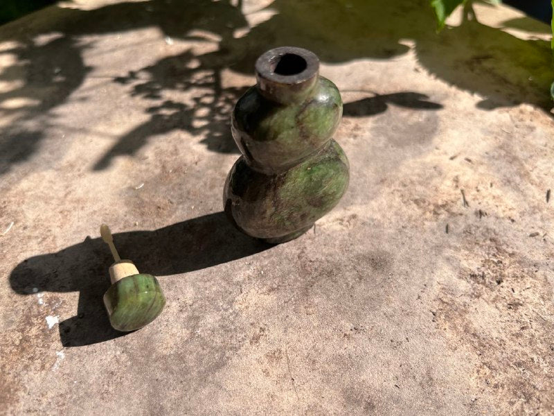 This exquisite miniature snuff bottle is carved from emerald-green stone, showcasing intricate craftsmanship and unique beauty. Its delicate, hand-carved design gives it a vintage charm, and the tiny wooden stopper perfectly complements its natural, earthy appeal. This collectible piece is ideal for both display and as a unique addition to any collection.